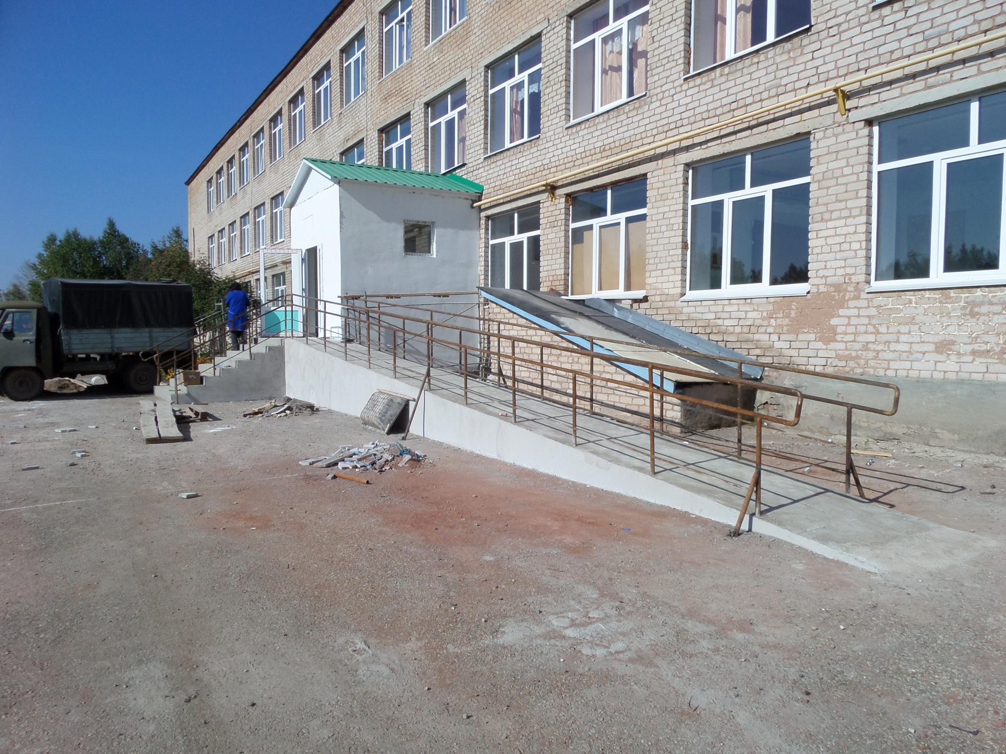 Сделан капитальный ремонт входной группы с обустройством пандуса. (Фото 8) Произведены такие виды работ: обустройство бетонной площадки, ступеньки крыльца, кладка стен, установка стропил, кровельное покрытие крыши из профнастила, штукатурка стен цементно- известковым раствором и окраска стен акриловым составом, устройство пандуса, монтаж поручней из круглой стали, масляная окраска металлических поверхностей, установка светильников, установка звонка электрического, установка дверного блока, покрытие лестницы плиткой.Оборудован пандус в соответствии с нормами. Закуплены напольное покрытие противоскользящее 4 кв.м. для обустройства входной группы.